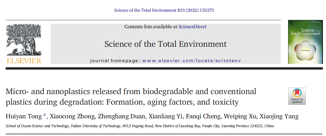 海洋科学与技术学院环境佟慧妍老师于2022年在国际期刊Science of Total Environment (JCR一区,IF=10.753)发表学术论文《Micro- and nanoplastics released from biodegradable and conventional plastics during degradation: Formation, aging factors, and toxicity》。