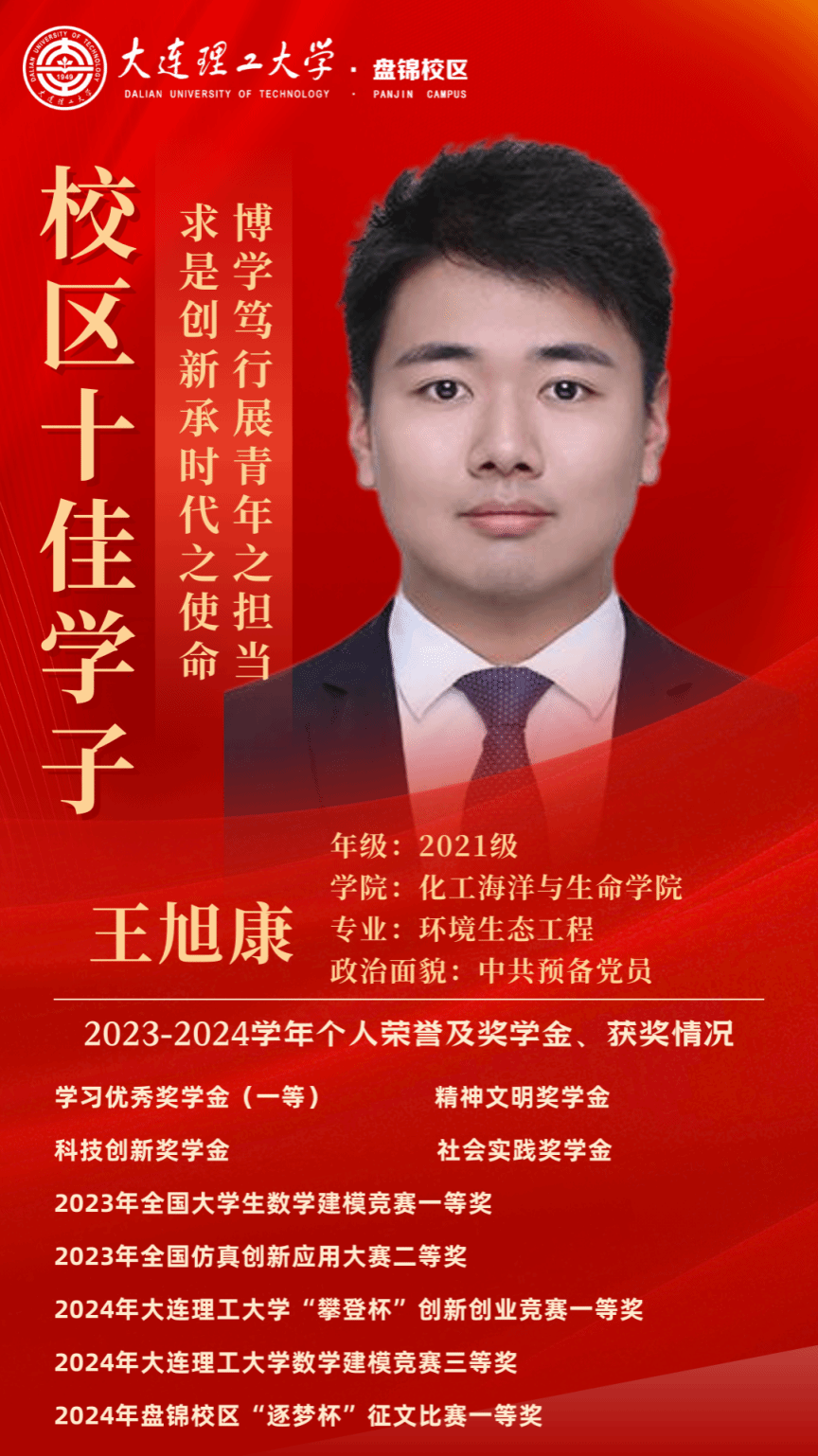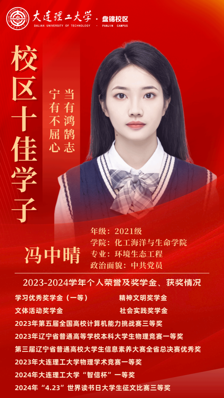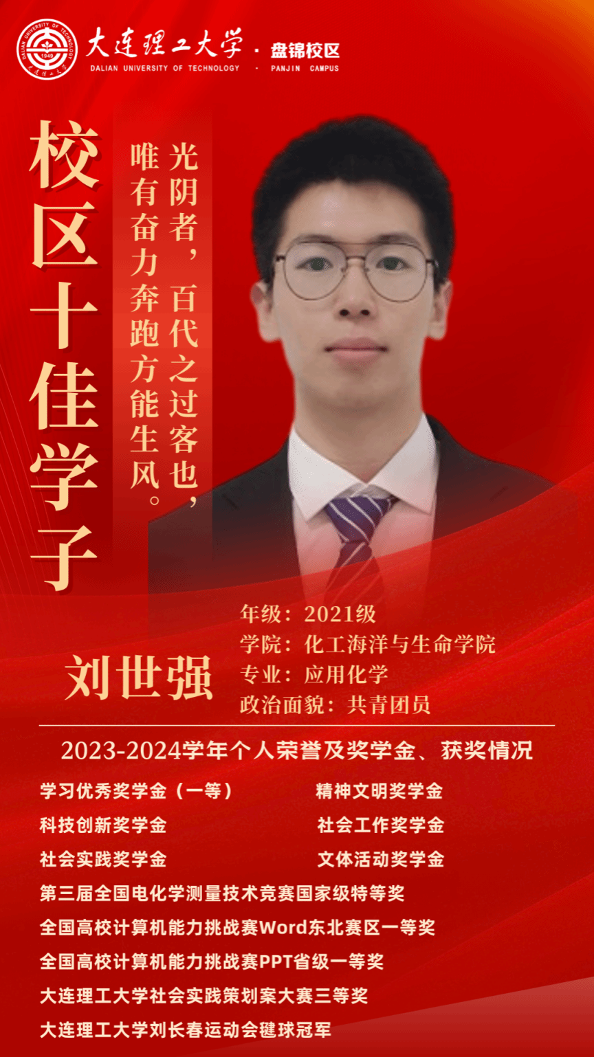 他们以拼搏为笔,书写青春华章;以奋斗为墨,绘就梦想画卷。他们不问来时路,只是一往无前地走在属于自己的奋斗的路上。经过他们的不懈努力,迎来的是属于他们的辉煌时刻。化工海洋与生命学院的学子不负众望,在大连理工大学盘锦校区第十一届“十佳学子”校评选中决出四名优秀学子,让我们一起看看他们的风采(按姓氏首字母排序):