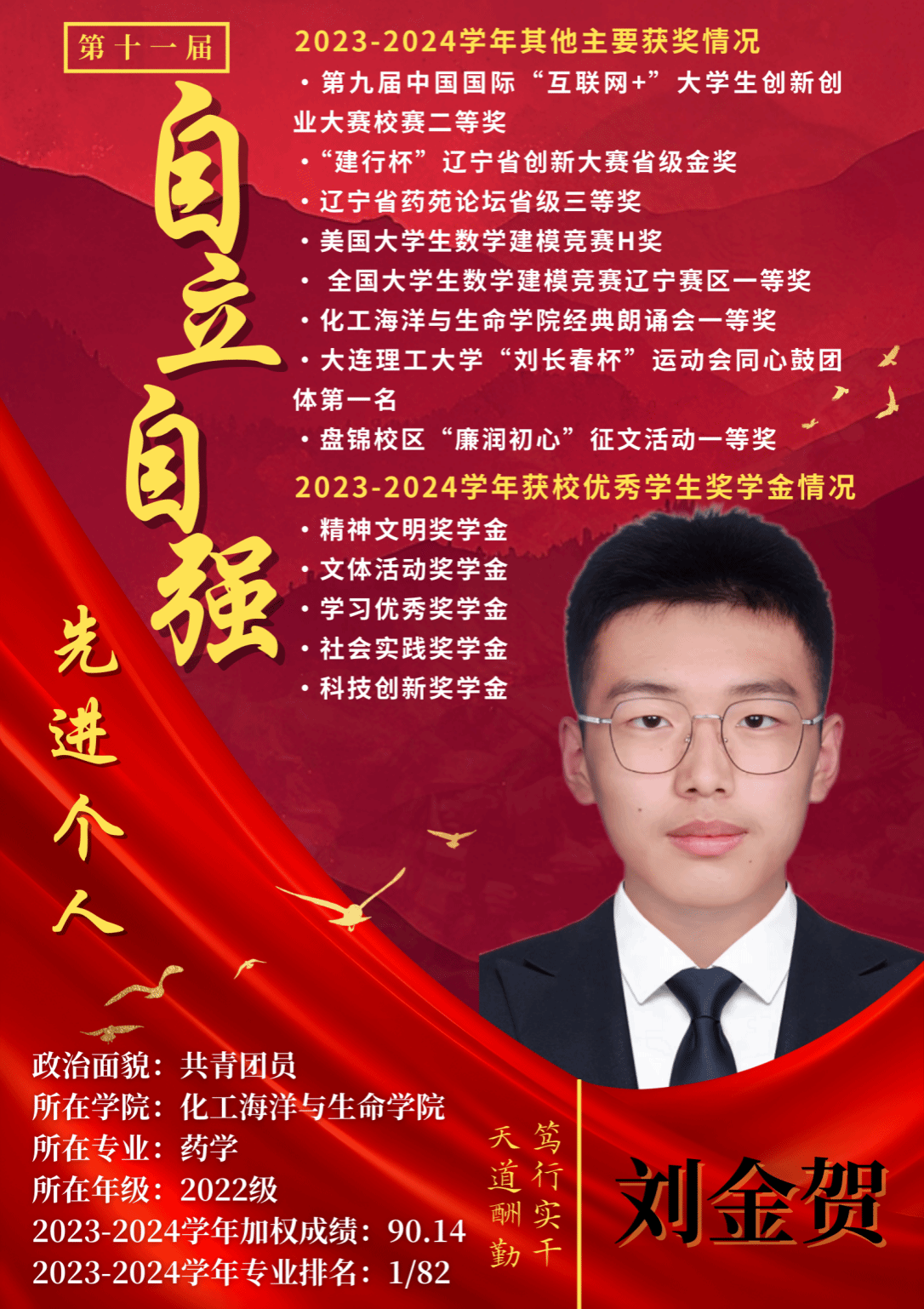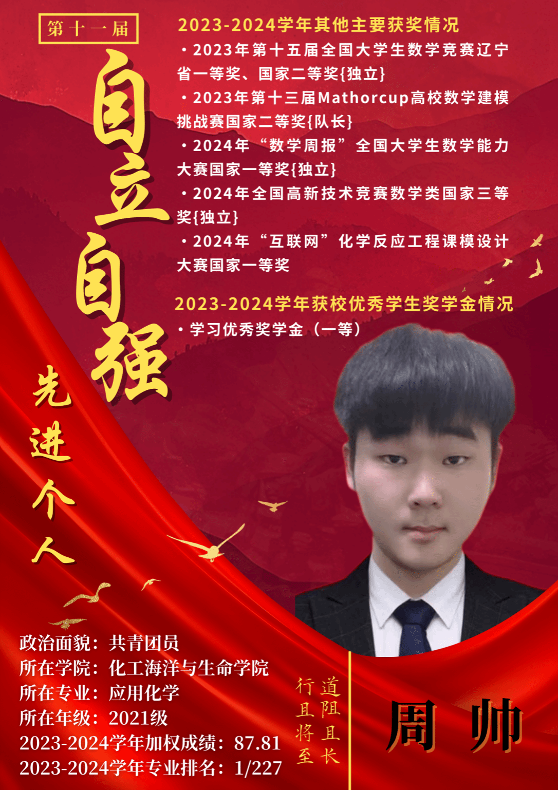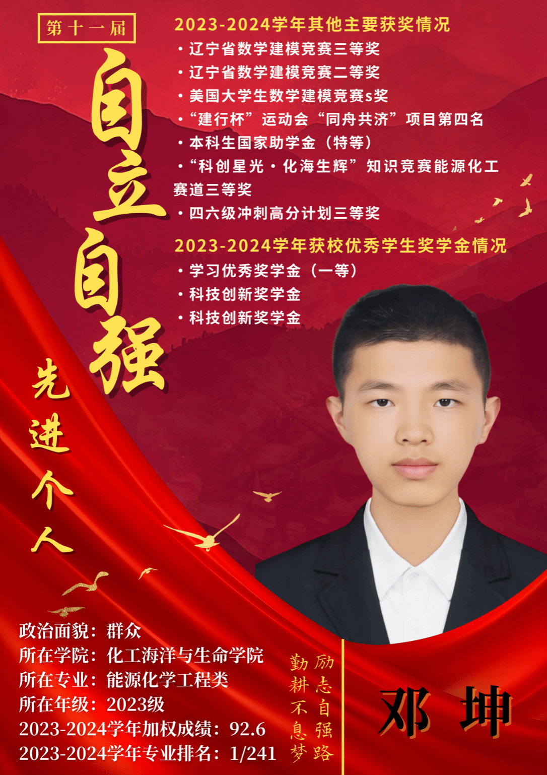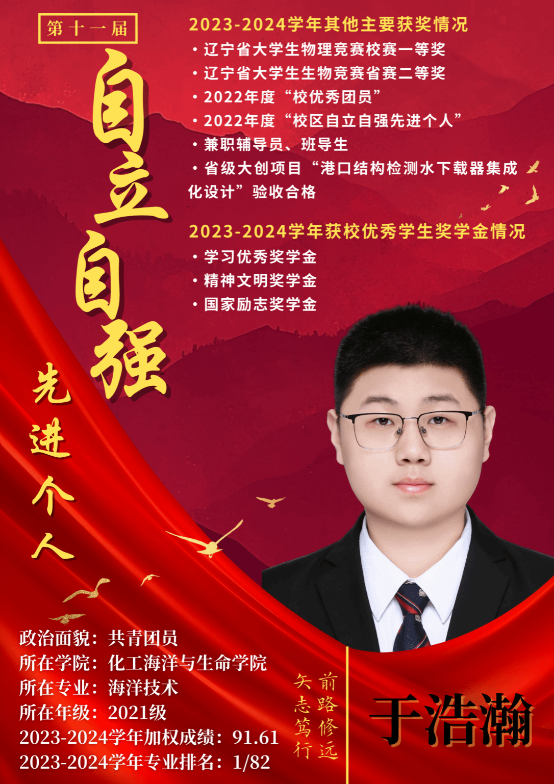 第十一届自立自强先进个人已经选出,其中诞生出五名化工海洋与生命学院优秀学子。对于他们来说自立自强先进个人的称号不仅是对他们过去努力的肯定,也是他们未来奋斗的动力,更是迷茫的同学学习方向的灯塔。他们从不缺少失败后从头再来的勇气,只是选择以坚定的信念和顽强的毅力去拼搏出自己的黎明。以下是他们的学习成果和获奖概况(按姓氏首字母排序);
