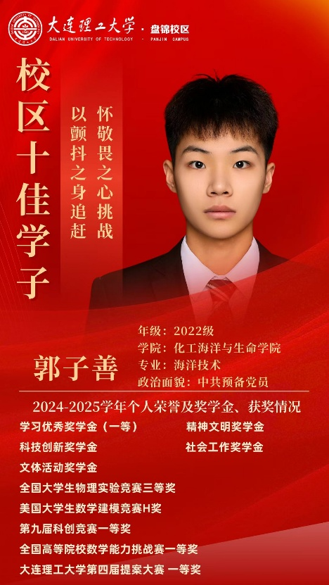 作为中共预备党员,郭子善始终牢记“为人民服务”的宗旨,将个人成长融入集体发展,三年间共担任9项学生工作,综合评测等级均为A级,用担当诠释“心怀大家的行动者”本色。