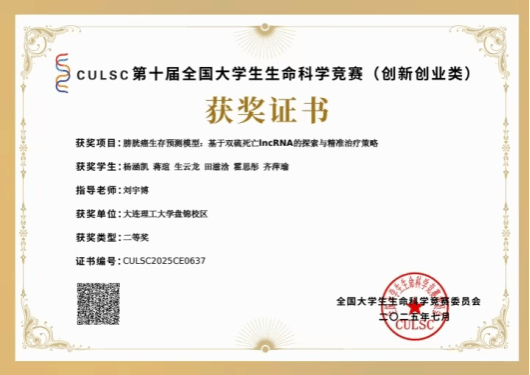 在竞赛舞台上,他同样表现出色。本学年,他作为队长,斩获了第十届全国大学生生命科学竞赛国家级二等奖。此外,在校内最高级别的科技竞赛“攀登杯”中,他也屡获佳绩。这些经历不仅锤炼了他解决复杂问题的实践能力、团队协作与领导力,更将课本上的理论知识与现实中的科学问题紧密结合起来,完成了从知识输入到能力输出的飞跃。