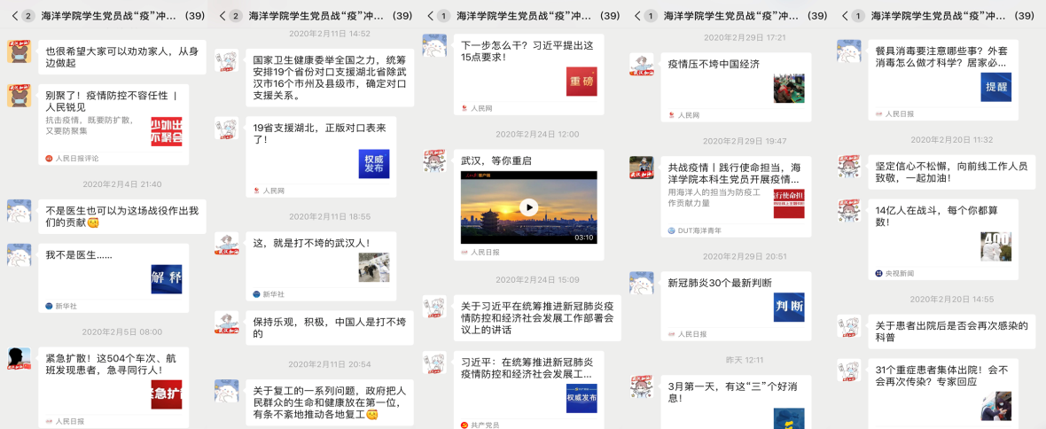 正是这一份担当与奉献,让他们赢得了身边师生的口碑,打牢了群众基础,在支部大会中以全票赞成发展成为光荣的中共党员。新冠肺炎疫情爆发后,他们第一时间加入到“海洋学院本师生纵向党支部战疫冲锋队”中,成为云端朋辈辅导员,让同学们在疫情期间“停课不停学”;他们利用网络自媒体,将权威官媒发布的疫情动态和辟谣信息第一时间转发至朋友圈和QQ空间;他们担任班级疫情防控网格小组负责人,认真细致完成班级每日健康监测,为疫情防控阻击战贡献自己的一份力量。