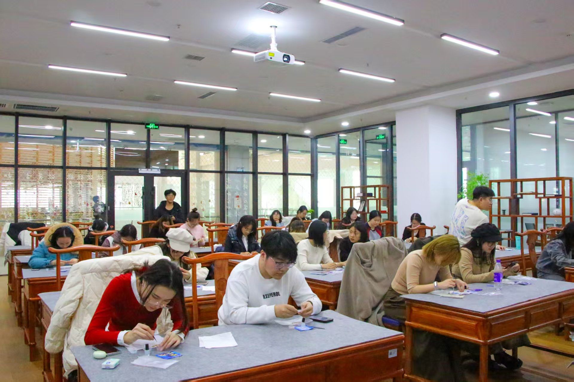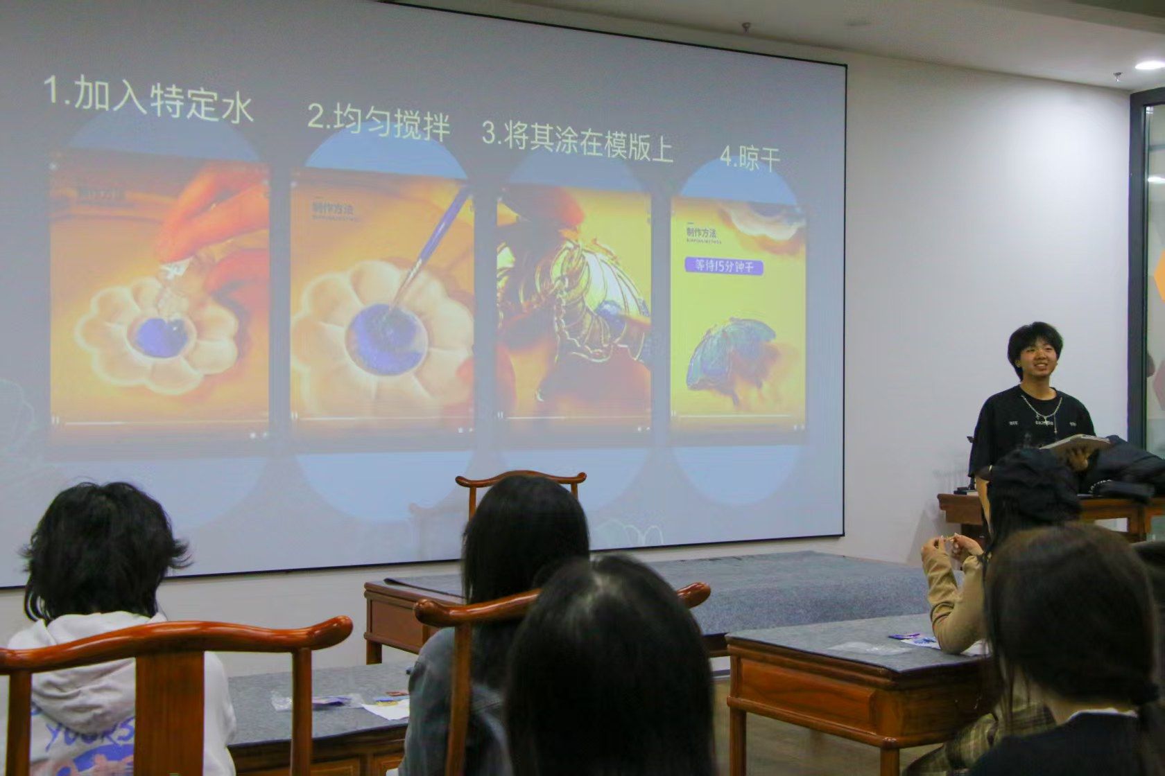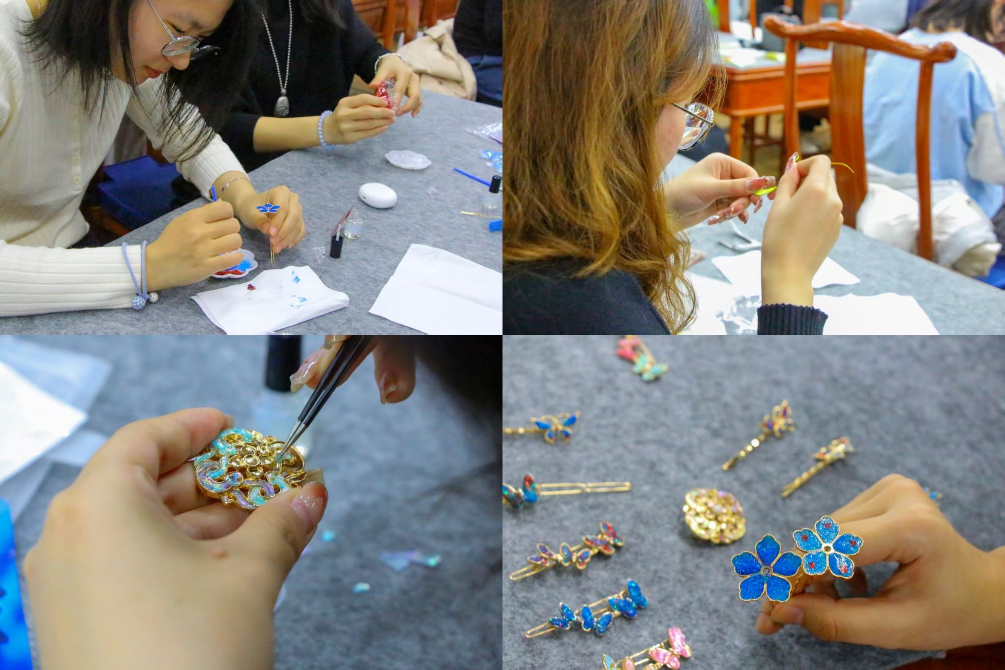3月9日下午,学院“非遗手作体验工坊”热闹开场。活动巧妙融合缠花、螺钿、染蓝三项国家级非物质文化遗产技艺,吸引百余名同学参与。在权益部同学的指导下,同学们将蚕丝线缠绕成栩栩如生的缠花发簪,用贝母碎片拼贴出流光溢彩的螺钿胸针,更以烤蓝为染料,亲手制作出靛蓝纹样的饰品。