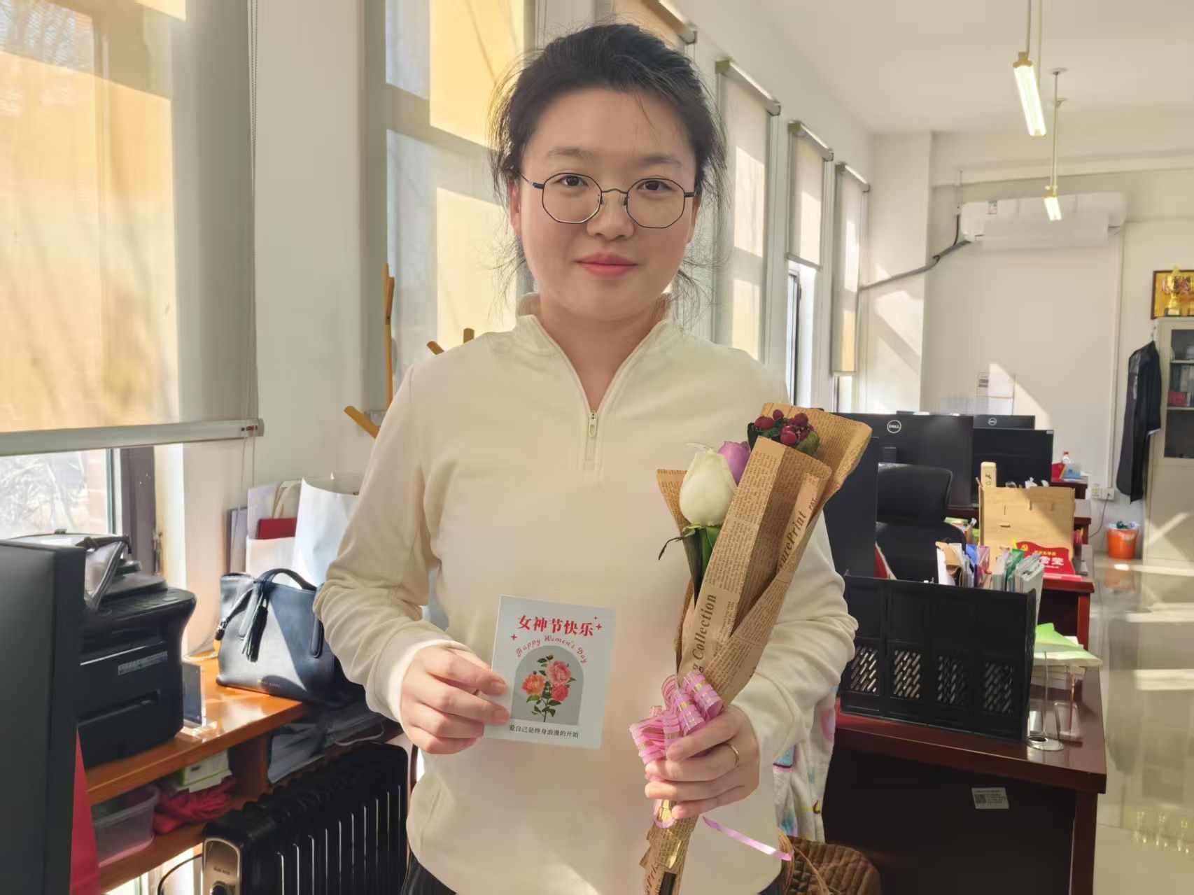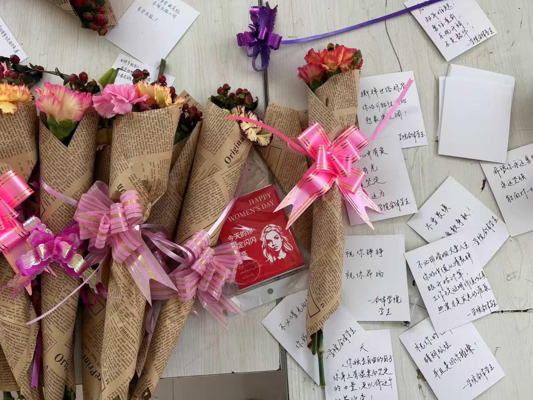 3月6日上午,学院楼内洋溢着温暖的气息。由权益部学生自主策划的“鲜花赠师”活动悄然启动。从花卉选购到包装设计,学生们全程亲力亲为:淡雅的康乃馨、清丽的玫瑰与百合交织成束,每一枝花都搭配手写贺卡,字句间满载对女教工的敬意与感激。两天内,六十多束鲜花陆续送至学院女教师、实验员及行政人员手中。活动不仅传递了节日祝福,更在细微处深化了师生情感联结,让感恩教育润物无声。