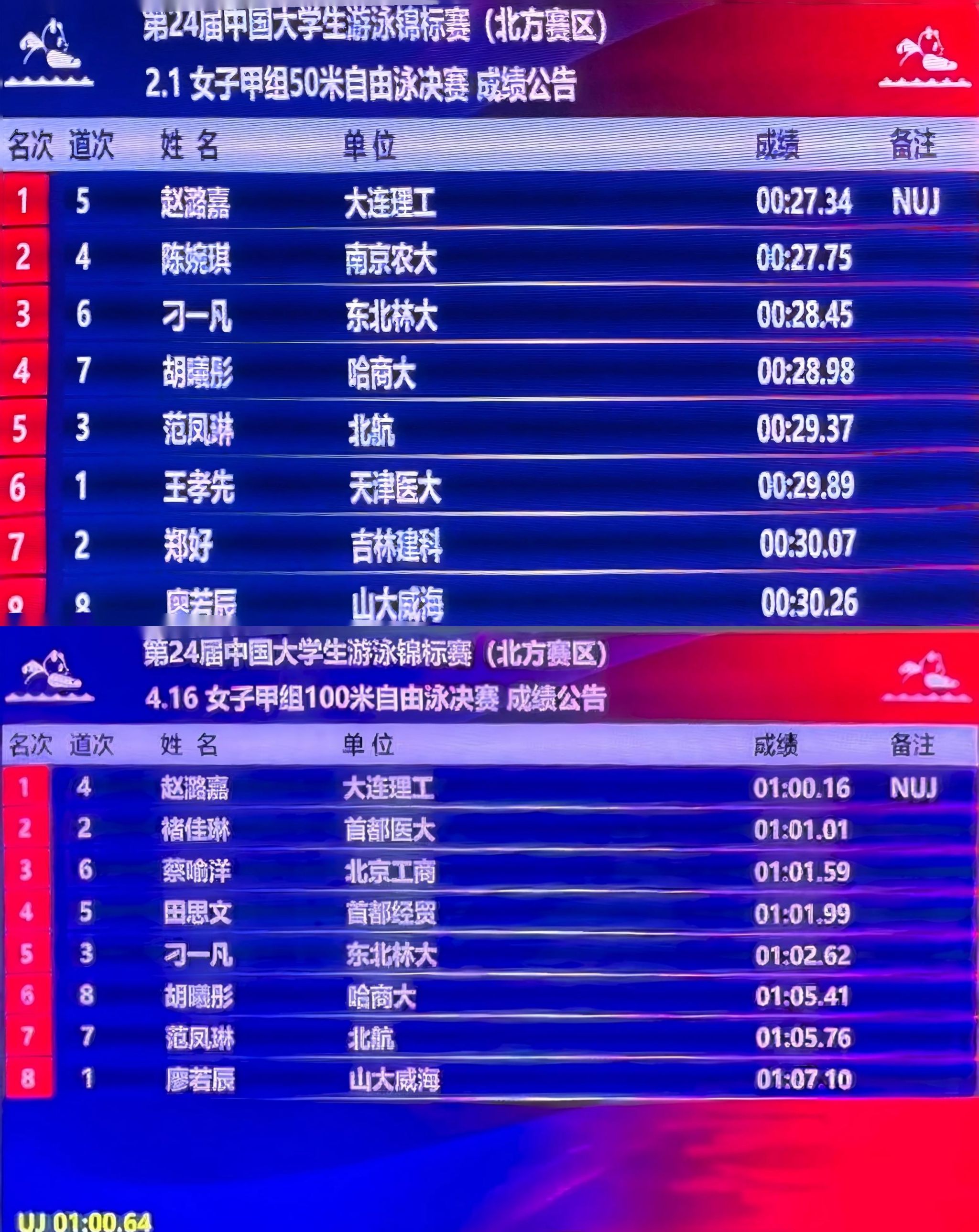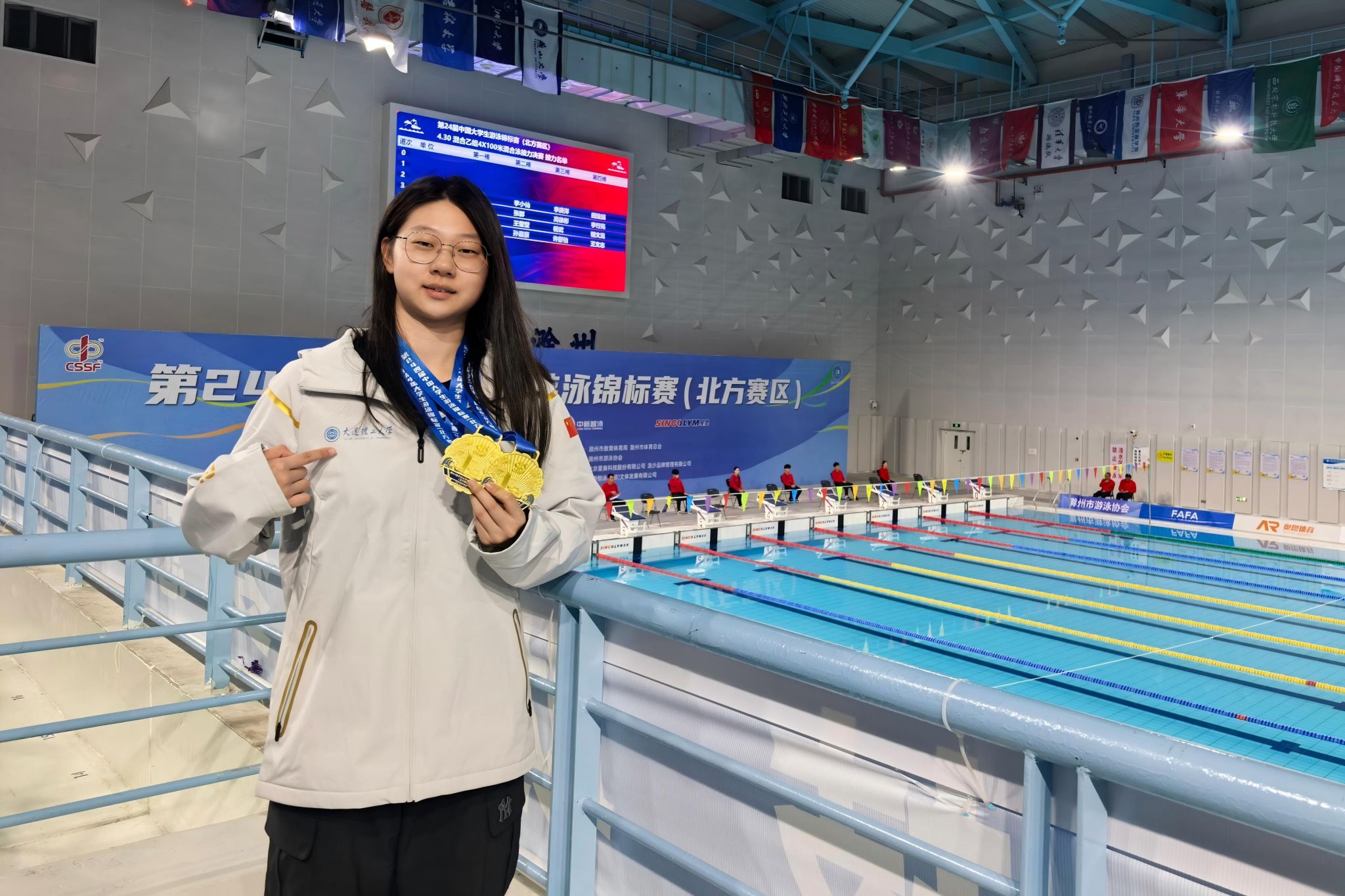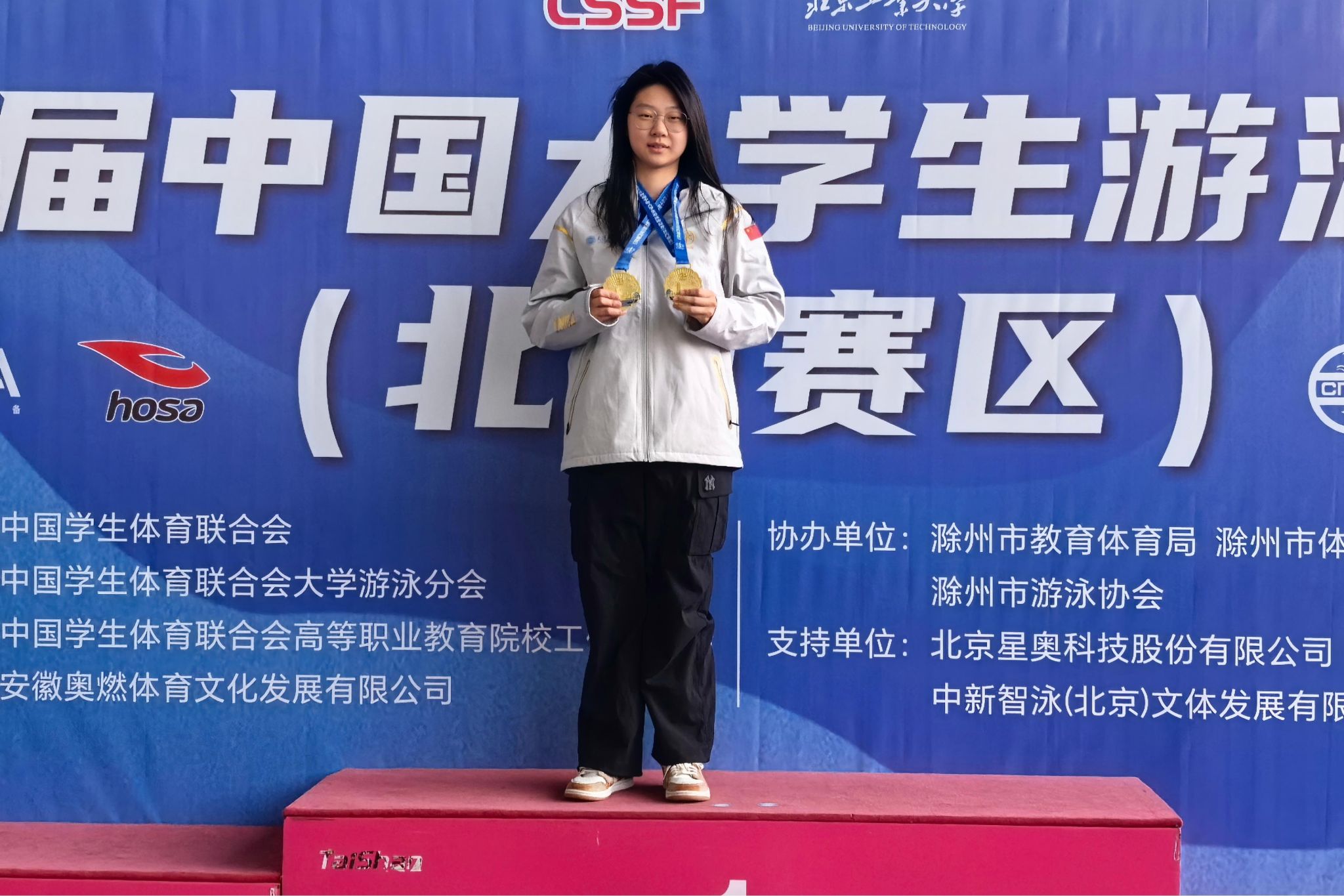 12月10日,第24届中国大学生游泳锦标赛(北方赛区)在安徽滁州奥体中心游泳馆圆满落幕。化工海洋与生命学院2025级学子赵潞嘉在比赛中发挥出色,连续取得优异成绩。她以27秒34夺得女子甲组50米自由泳冠军,并创造新的赛事全国纪录;随后,在100米自由泳项目中,游出1分00秒16的好成绩,再次夺得第一名并打破赛事全国纪录,展现了突出的竞技实力。