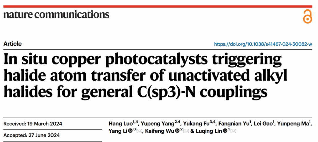 近日,化工海洋与生命学院李阳副教授与大连理工大学化学学院和中国科学院大连化学物理研究所的合作者共同在Nature Communications上发表论文(Nat. Commun. 2024, 15, 5647,影响因子16.6),报道了一种原位生成的吡啶基卡宾铜催化剂可成功用于未活化卤代烃的C(sp³)-N偶联反应。