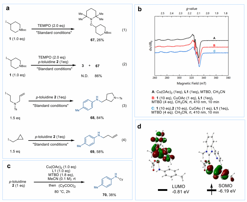 该催化剂可实现未活化烷基碘化物和多样化的氮亲核试剂(高达十多种不同类型的氮源)发生的常规C(sp3)-N偶联反应。机理研究表明,铜催化剂不需要与N-亲核试剂结合进行光吸收,这使得不同氮亲核试剂在偶联过程中具有兼容性。通过自由基捕获、自由基时钟和电子顺磁共振实验,支持了电子转移机制过程中同时形成烷基自由基和二价铜配合物。