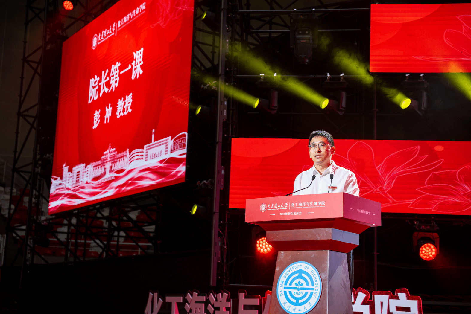 见面会在庄严的国歌声中拉开帷幕。学院院长彭冲教授以“立心铸魂启新程,知行合一赴山海”为主题致欢迎辞并讲授“院长第一课”。他系统阐述了学院自建院以来的学科沿革与发展愿景,聚焦“知院、知势、知责、知路”四大维度,深入剖析能源化工、海洋技术、环境食品、生命药学等学科的布局特色与国家战略意义。彭冲指出,在“海洋强国”和“科技自立自强”战略引领下,学院学科布局与时代发展方向高度契合,勉励新生坚定理想信念、锤炼创新能力,主动将个人成长融入国家发展大局,做心怀家国、知行合一的“化海生人”。