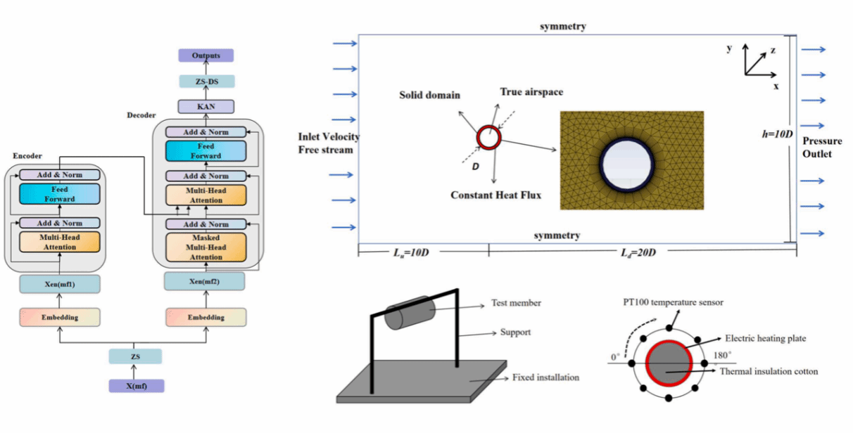 针对极地装备表面热损失机理复杂、试验条件苛刻等难题,研究团队创新性地建立了低温风洞实验—ANSYS-Python联合仿真平台,并基于拉丁超立方取样生成3万组样本数据。研究提出KAN-Transformer混合模型与SHAP解释性框架,实现了对极地条件下表面热损失的高精度预测(MSE=0.009、MAE=0.050、R²=0.991)。相关成果发表于《Applied Ocean Research》(2025年第162卷,Article 104733),为极地设备热防护参数优化与结构设计提供了可解释的定量依据。