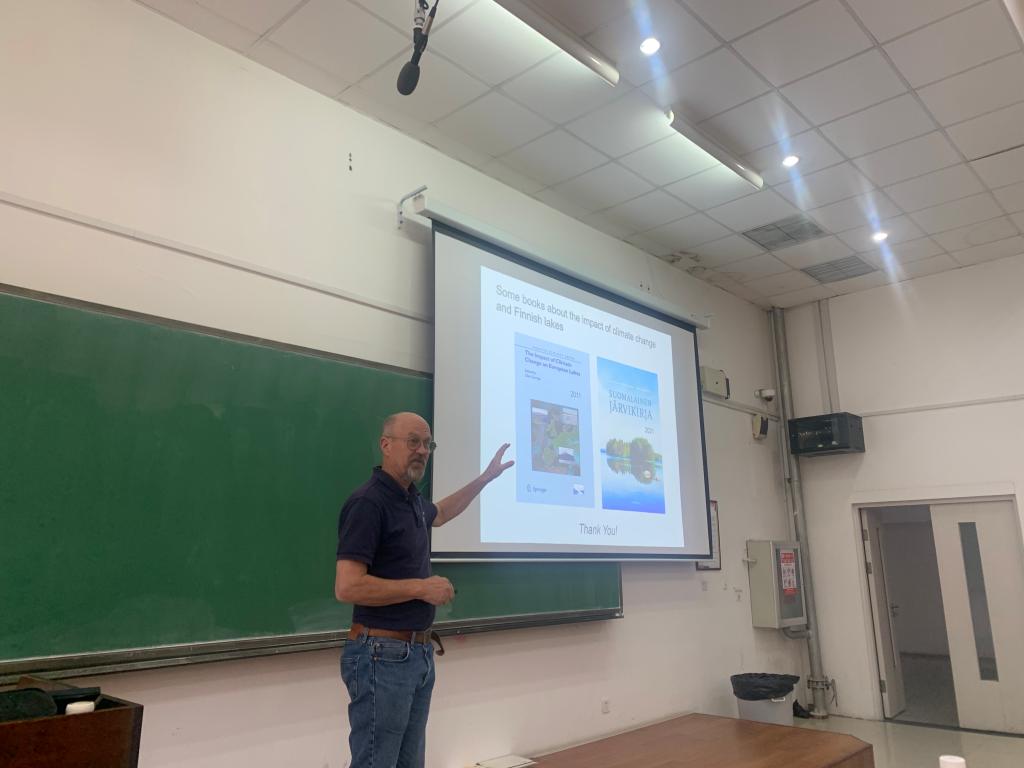 Lauri Arvola教授就全球气候变暖背景下,观测到芬兰冬季冰期时间缩短,影响湖泊水环境、热动力学、化学性质及营养负荷、冰下生物生存等现象和趋势,进行了分析探讨。他介绍了北极圈内部和芬兰中部多个研究区域的湖泊水环境、水生态连续观测体系,列举了N、P、DOC、土壤基岩、气候等相关参数和指标,包括芬兰湖泊水生态、水环境研究案例及新成果。