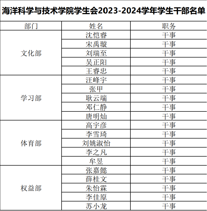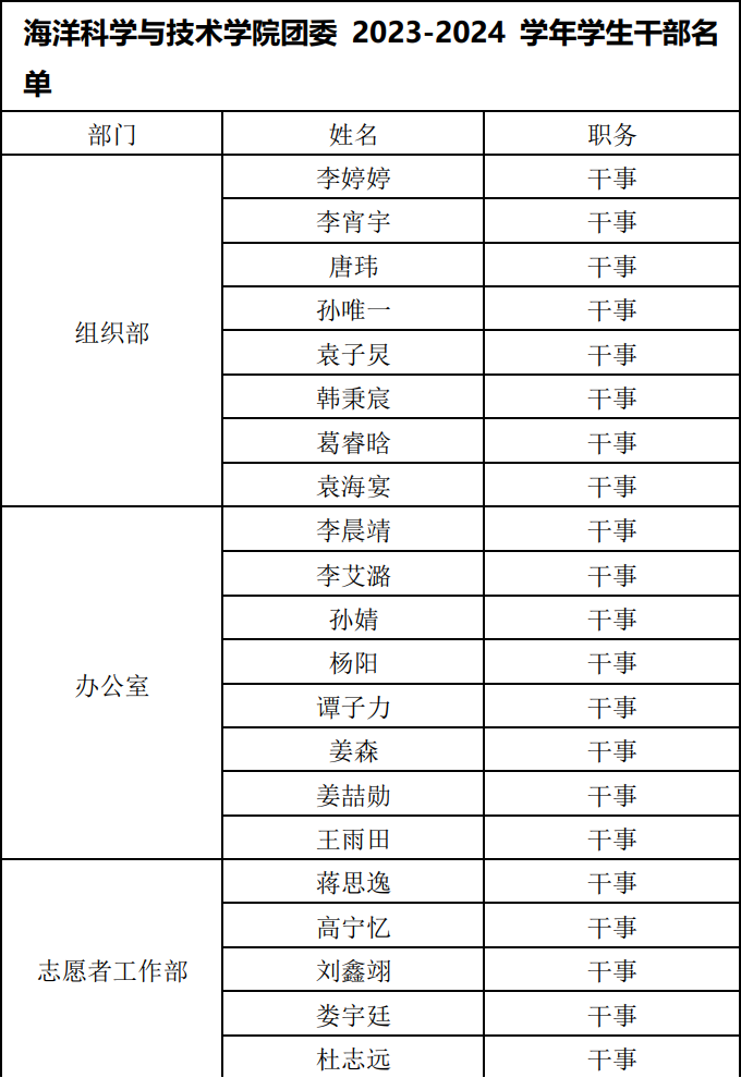 经过材料初审、面试等环节的综合考量,共青团大连理工大学海洋科学与技术学院委员会、大连理工大学海洋科学与技术学院学生会22023-2024学年学生干部纳新名单现已确定,详情如下: