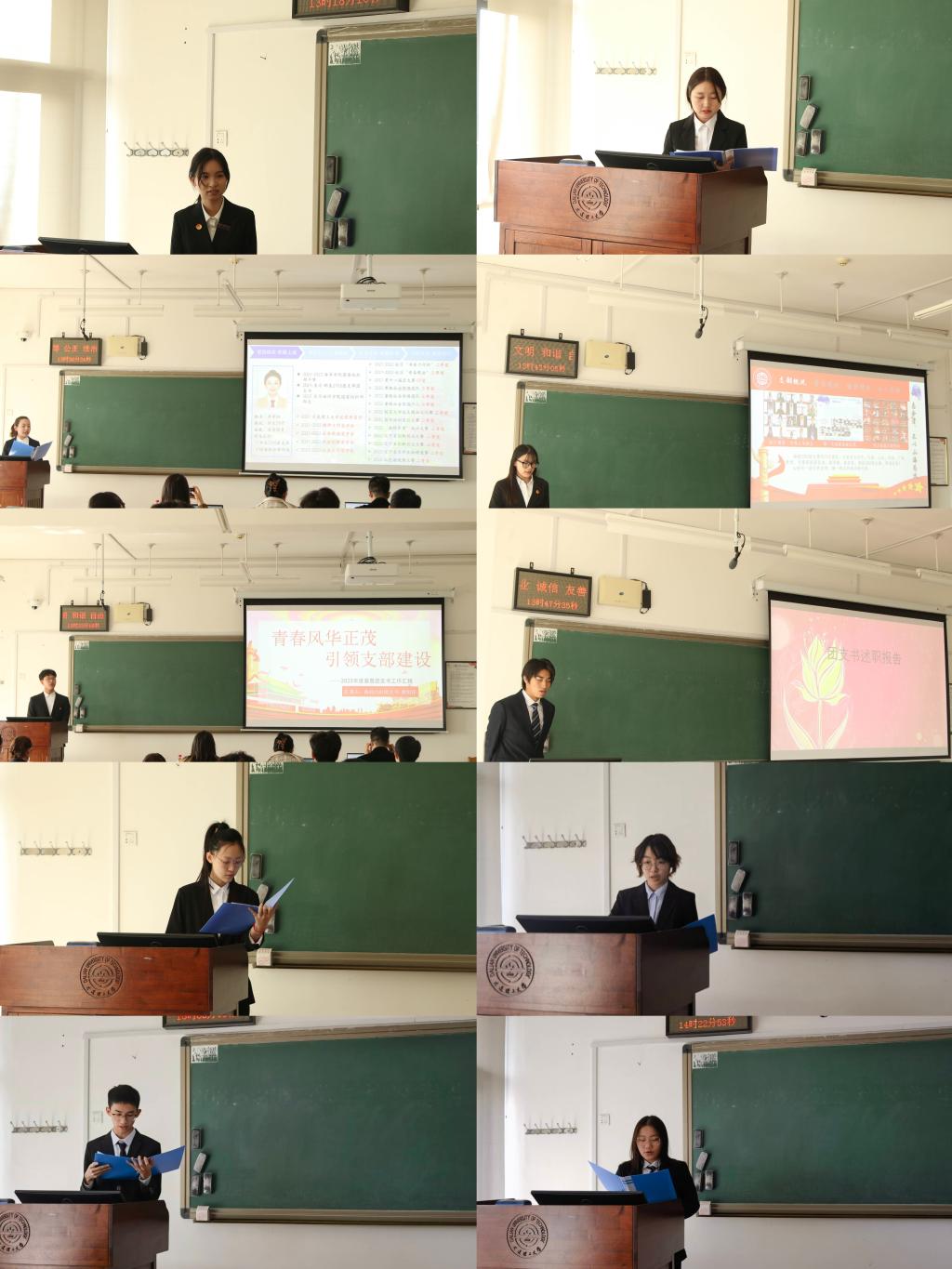 会上,各支部团支书以PPT汇报的形式阐述了上学期日常工作要点,从道德品行建设、工作成效回顾、未来工作展望等方面进行全面汇报,就工作中遇到的问题提出了进一步的解决方案,回顾过去的成就与不足,整装待发。在述职过程中,三位老师也分别对每位团支书进行了提问和点评,充分肯定了各团支部的工作成果,赞扬了各团支部的创新性、突出性做法,随后指出了工作汇报中的不足,并给出了实用性的指导意见,同时对未来的工作提出要求。
