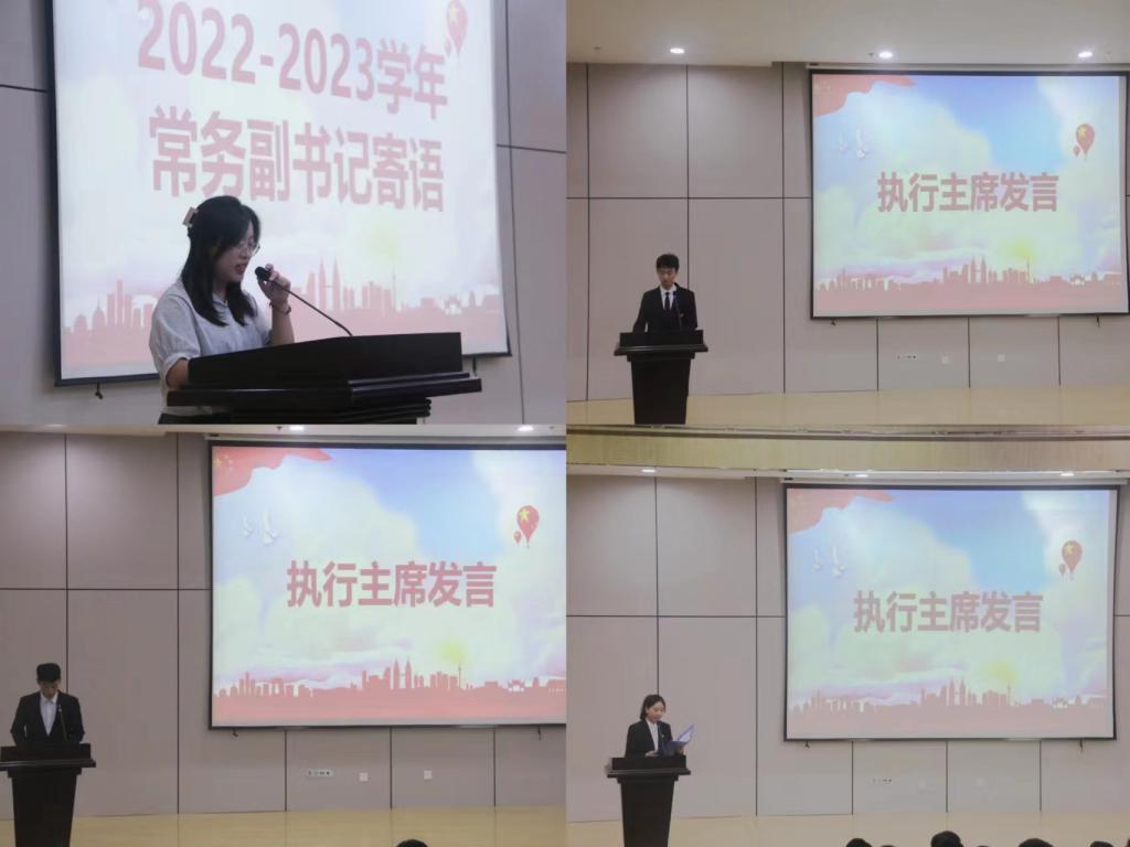首先,学院团学书记团、主席团成员对团学工作作出了展望及介绍。2022-2023学年常务副书记夏毓晗以“守护”为主题,希望团学成员坚定“功成不必在我,功成必定有我”的责任意识。新任书记团主席团号召团学成员团结一心,共同努力,发挥引领作用,展现海洋青年的精神风貌,铸造魅力团学,用力量点燃梦想。