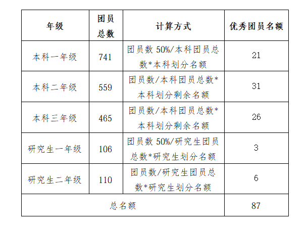 3.优秀团员根据学生基本信息核算团员基数,结合学院情况,拟以本研各年级为单位划分名额。本科一年级、研究生一年级按实际团员人数乘以50%计算名额,本科二年级、本科三年级、研究生二年级按照实际团员人数比例计算名额,具体如下表: